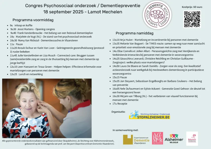 Dit unieke evenement brengt toonaangevende wetenschappers, zorgprofessionals en betrokken organisaties samen rond de nieuwste inzichten, praktijkvoorbeelden en strategieën om de levenskwaliteit van mensen met dementie te verbeteren en preventie te versterken.
