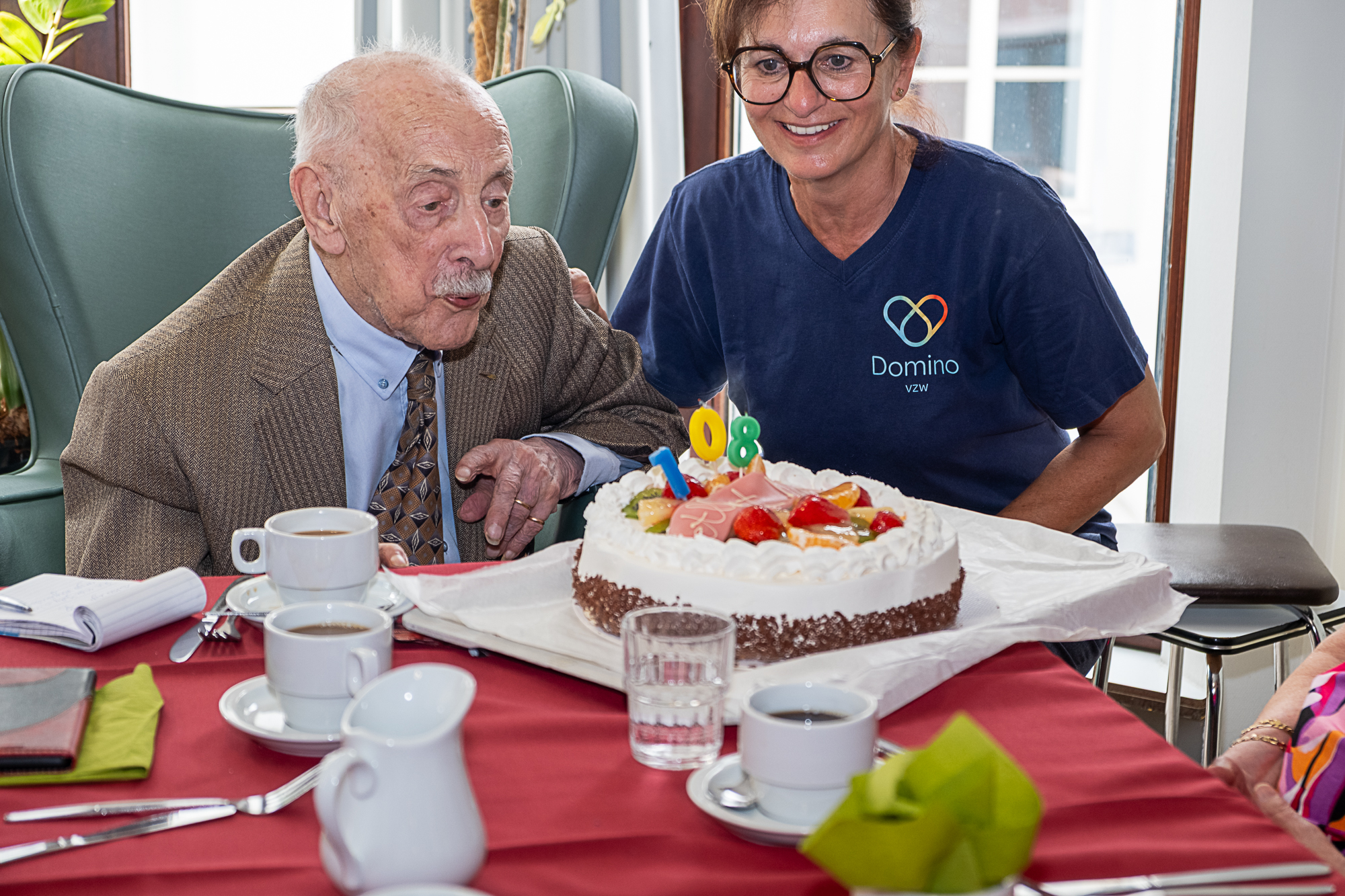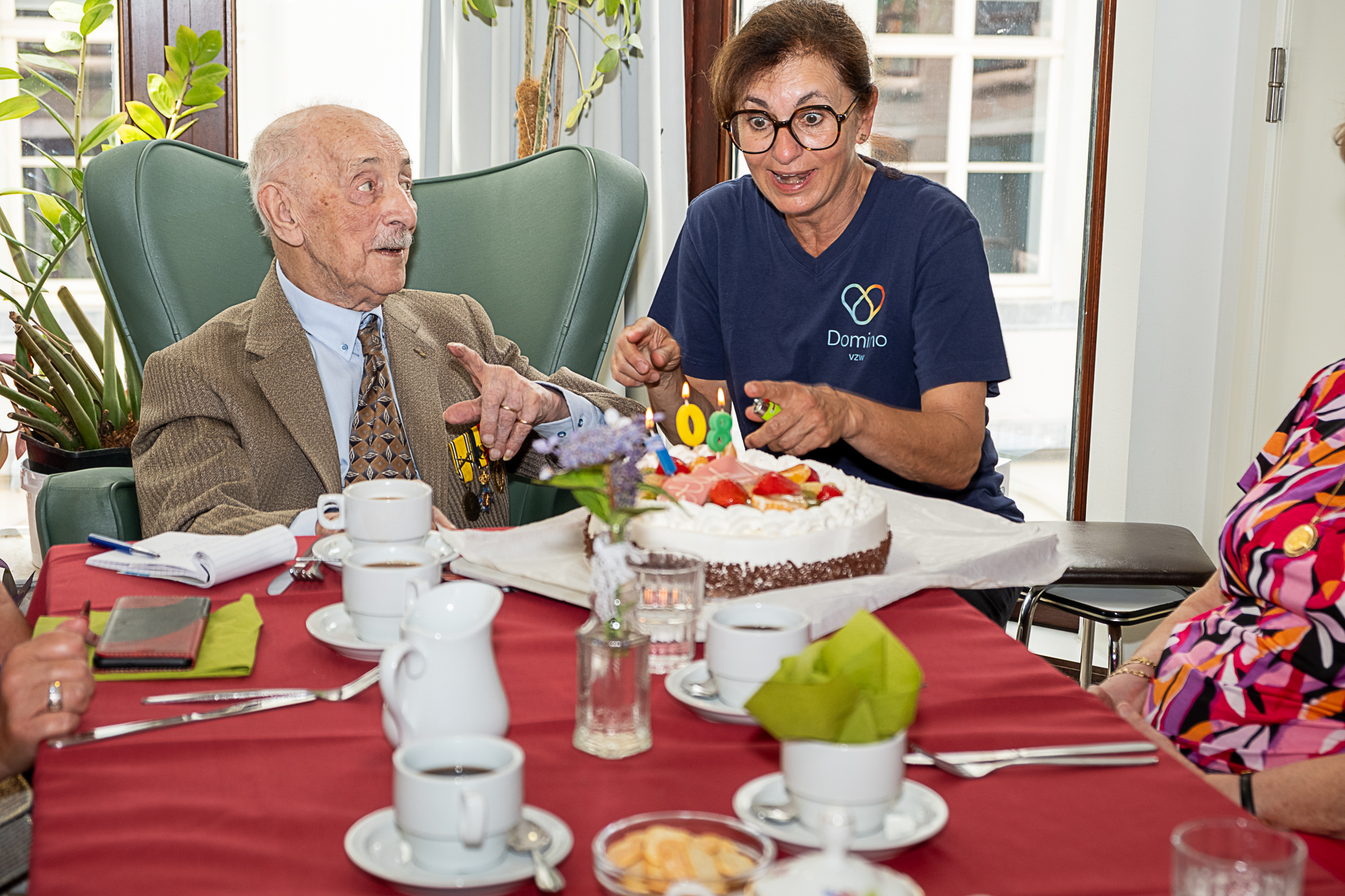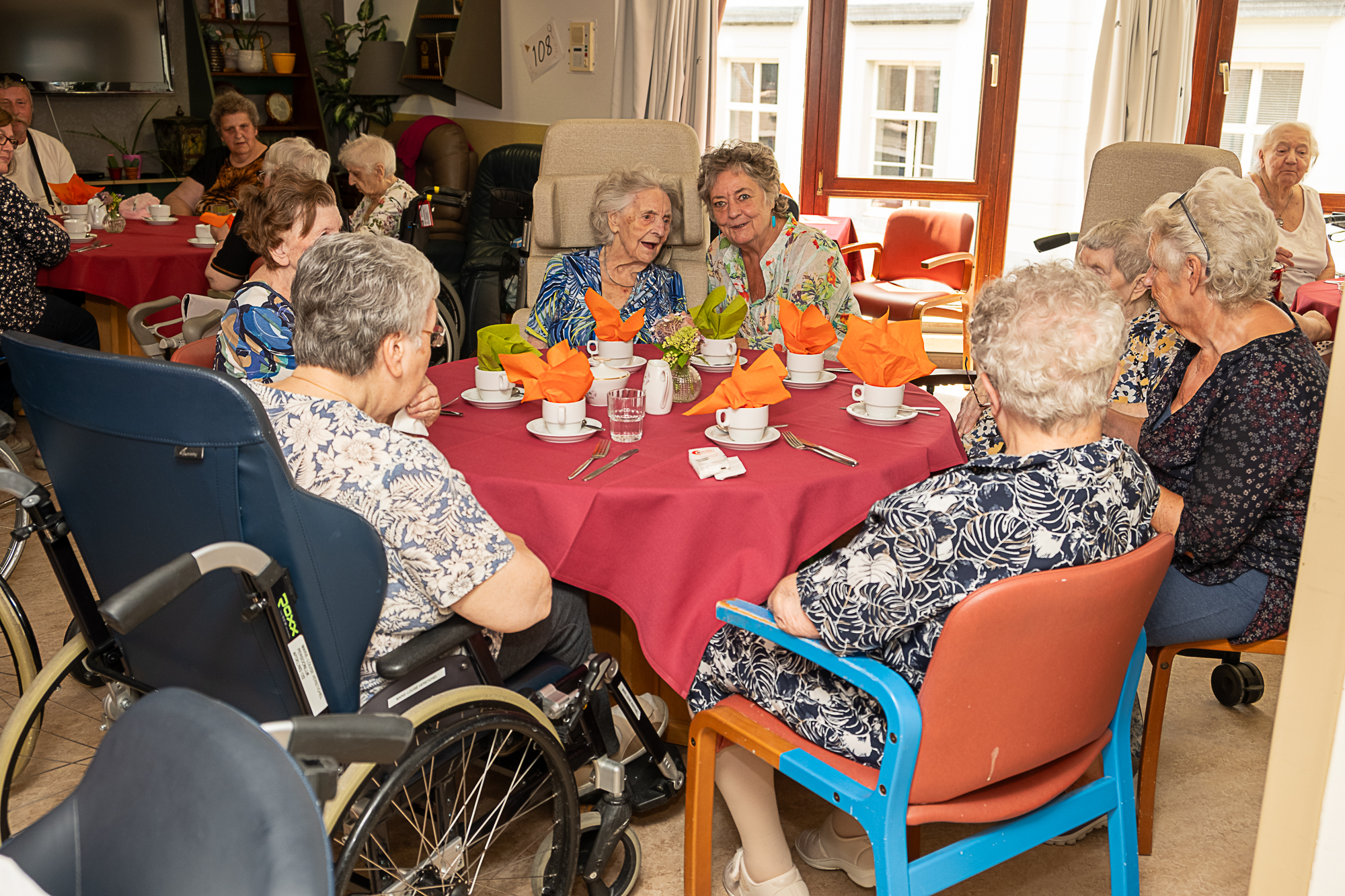 Abert trakteerde zijn familie maar ook medebewoners en het personeel op een cava of fruitsap. Uiteraard mocht een stuk taart met obligatoire koffie niet ontbreken.