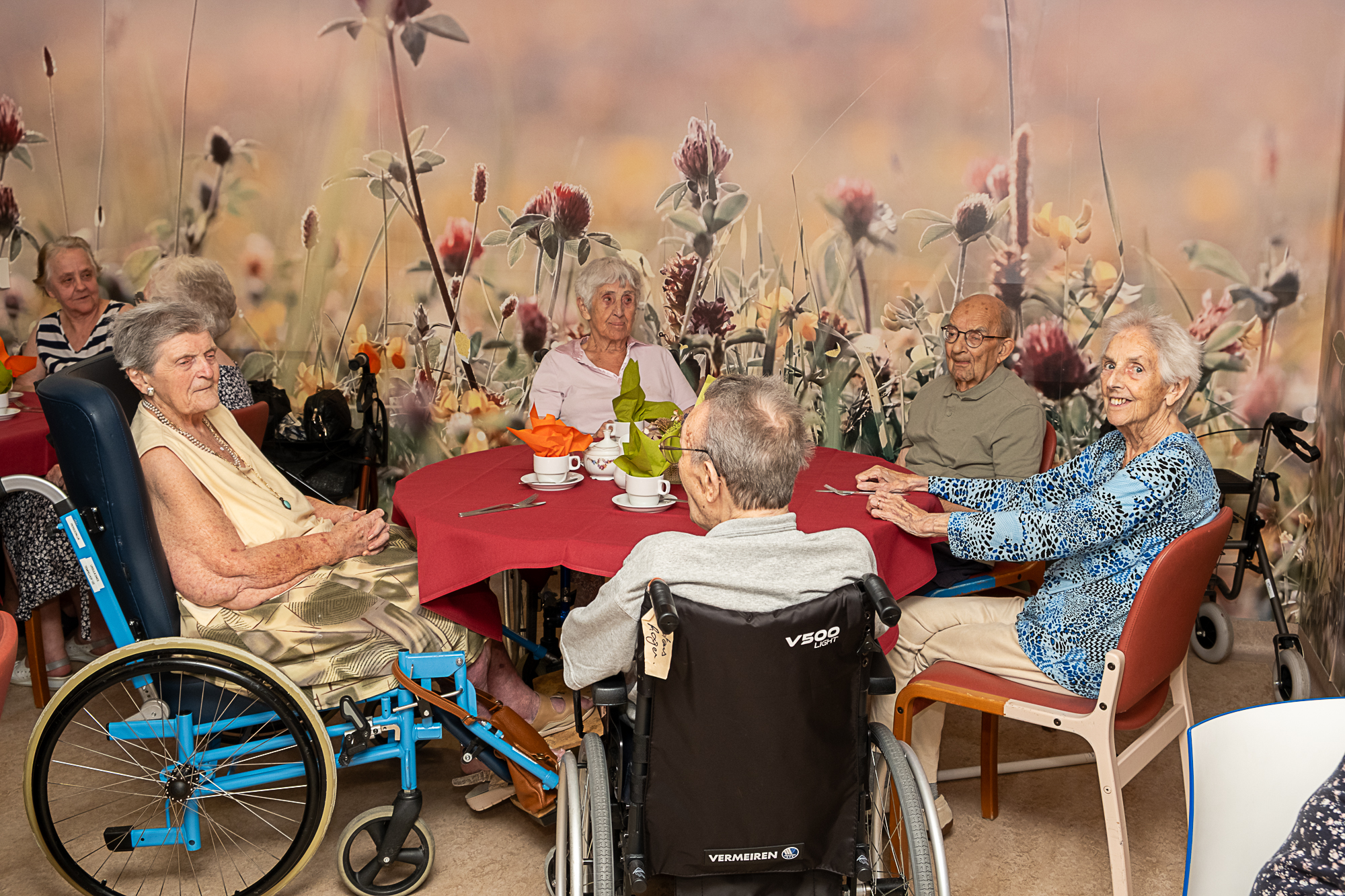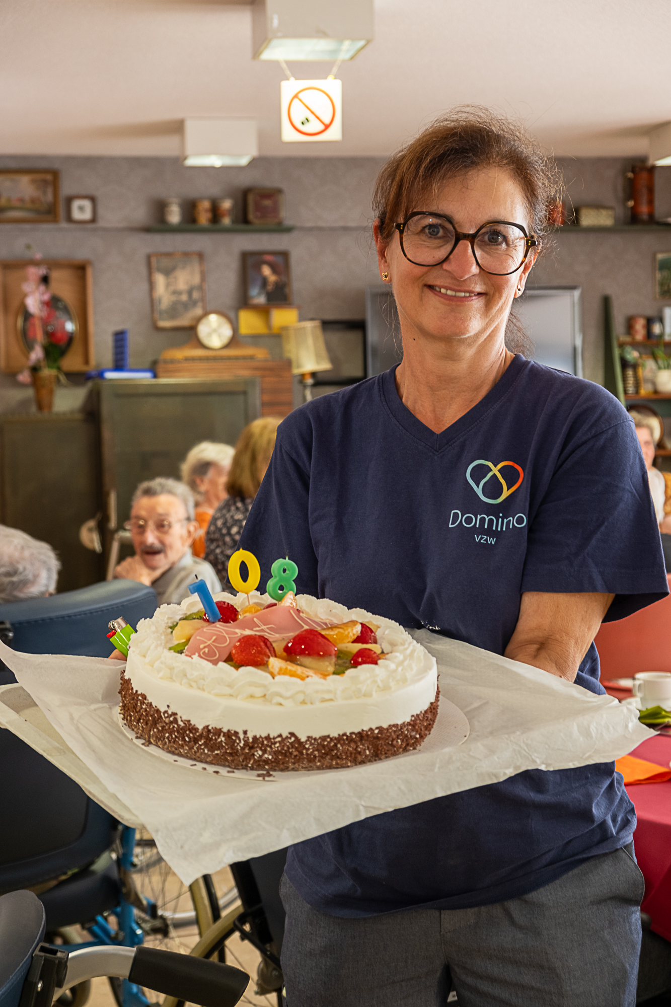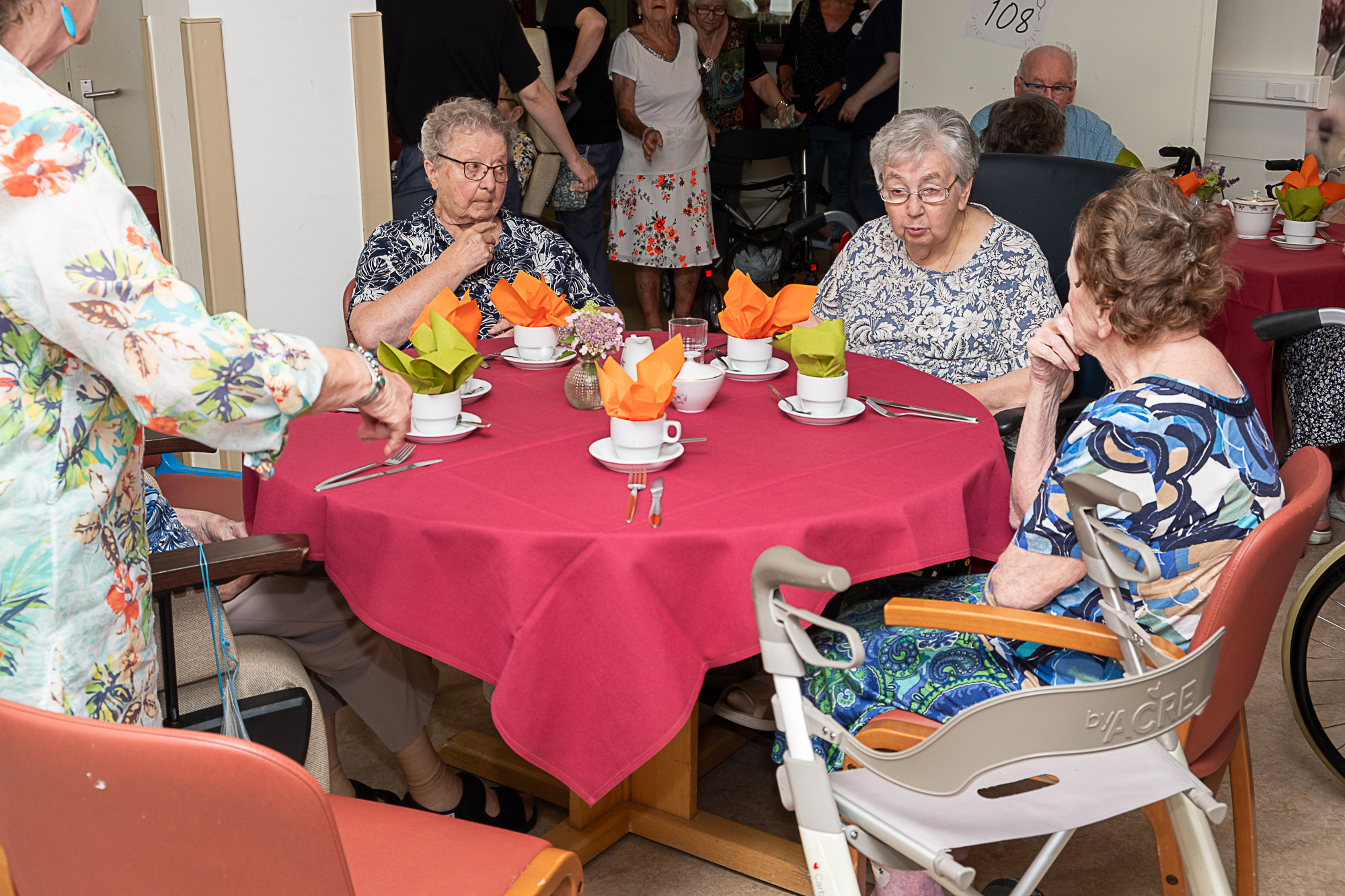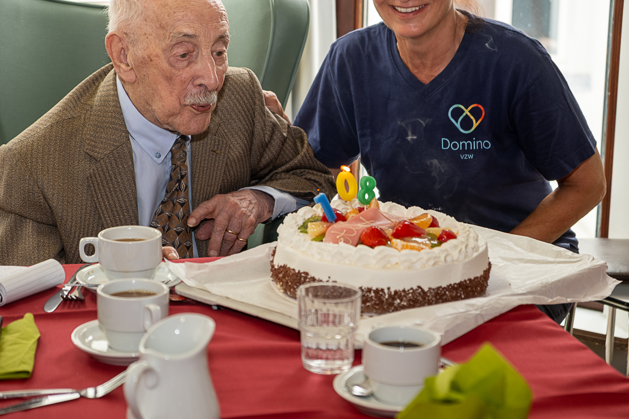 Abert trakteerde zijn familie maar ook medebewoners en het personeel op een cava of fruitsap. Uiteraard mocht een stuk taart met obligatoire koffie niet ontbreken.