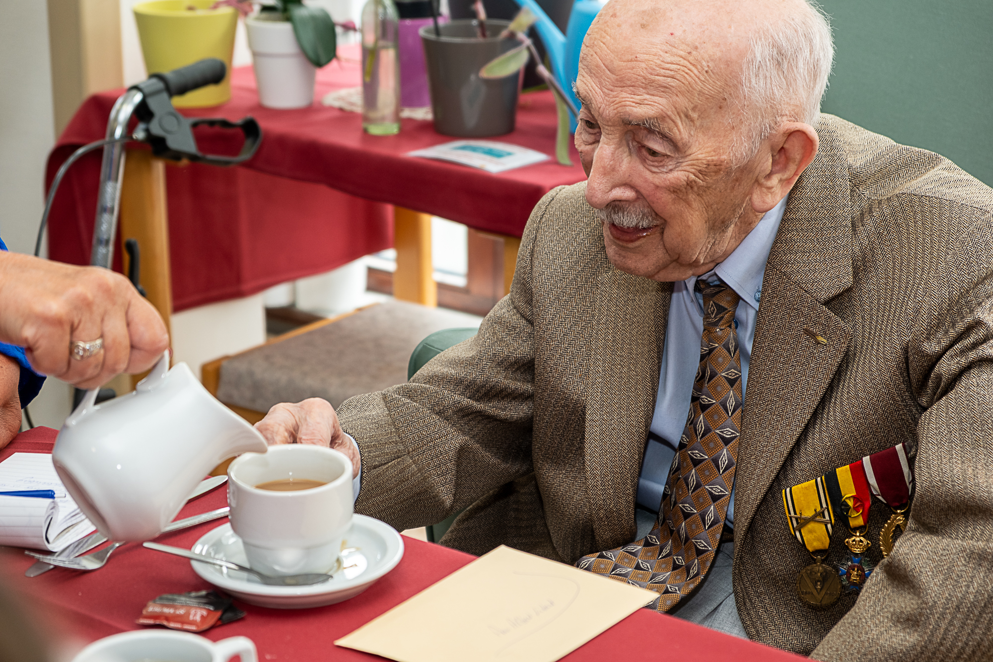 “In WOII vocht ik mee in de slag van Ronsele, bij Zomergem. Ik hoopte toen altijd dat het nooit meer oorlog zou worden, dat men eruit zou leren. Maar mijn hoop dat de slachtoffers van de eerste en tweede wereldoorlog de laatste zouden zijn bleek tevergeefs. Men leert maar niet.” Zegt Albert met tristesse in de stem. En dan volgt de wijze raad van iemand met 108 jaar ervaring: “Als iedereen lief en vriendelijk is voor zijn naasten dan werkt dat hopelijk aanstekelijk, wereldvrede begint klein.”