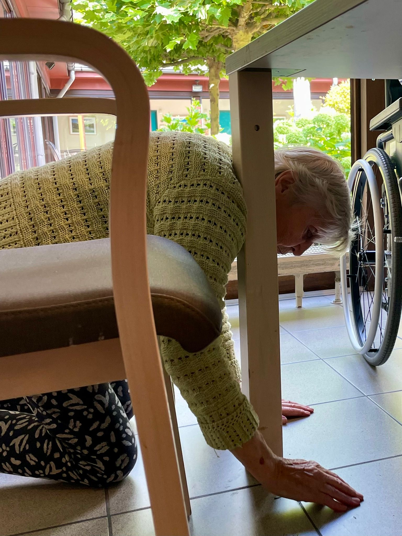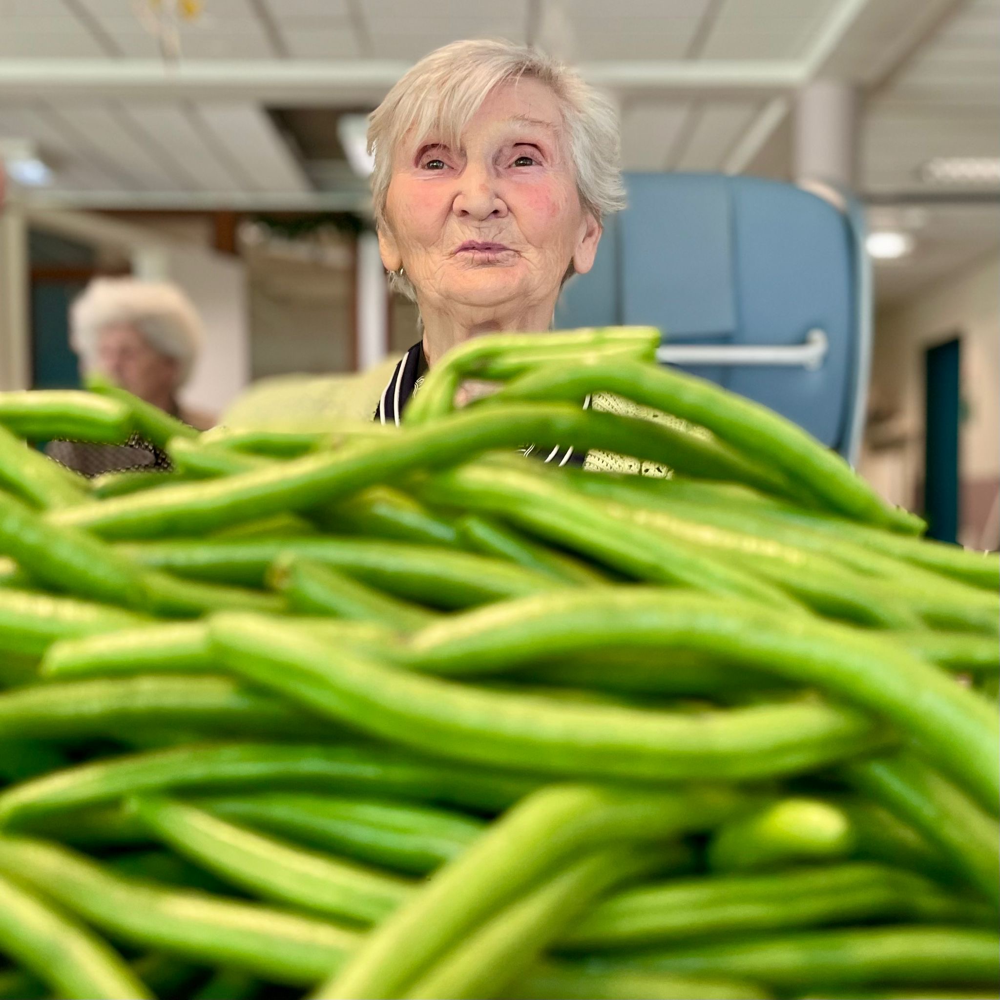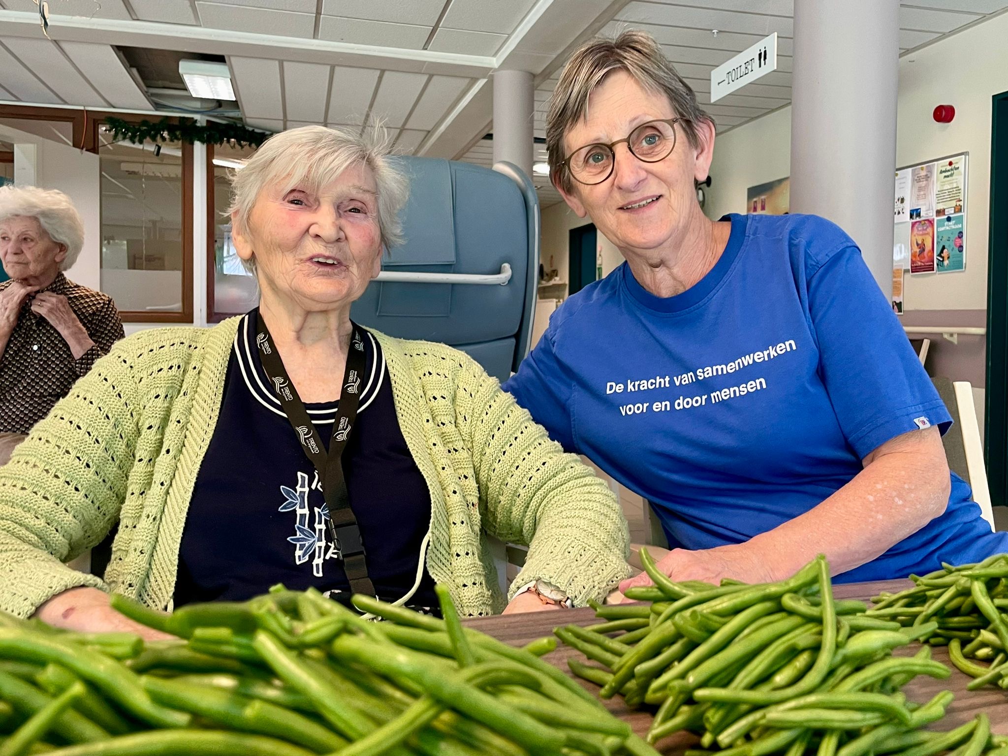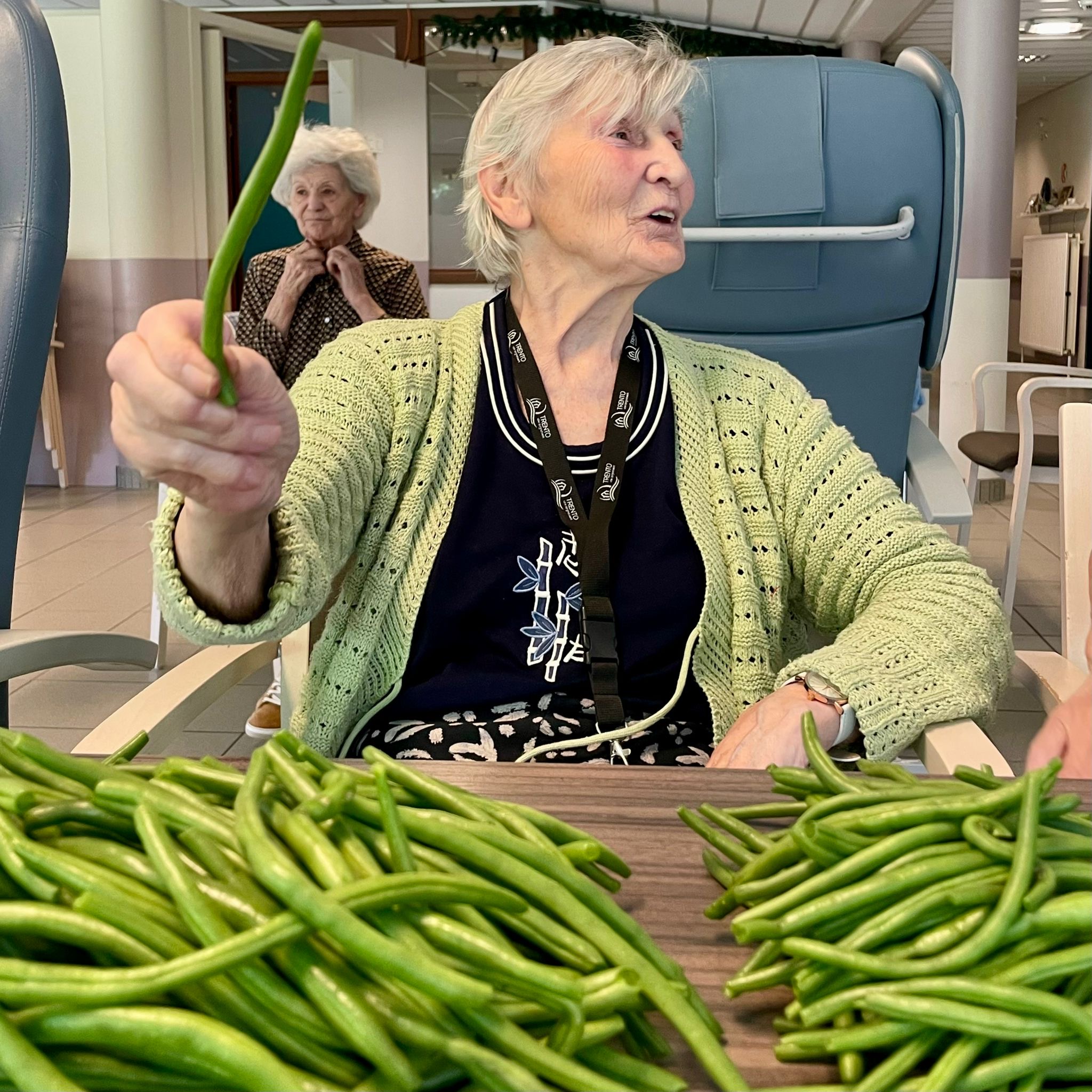 Ik had zojuist een zak versgeplukte boontjes gekregen van een vrijwilliger en ik bracht ze mee naar de living van onze beschermde leefgroep. Tijd om te antwoorden had ik niet want mevrouw had de zak al voor haar op tafel gezet en het handwerk waarmee ze bezig was had ze aan de kant gelegd.