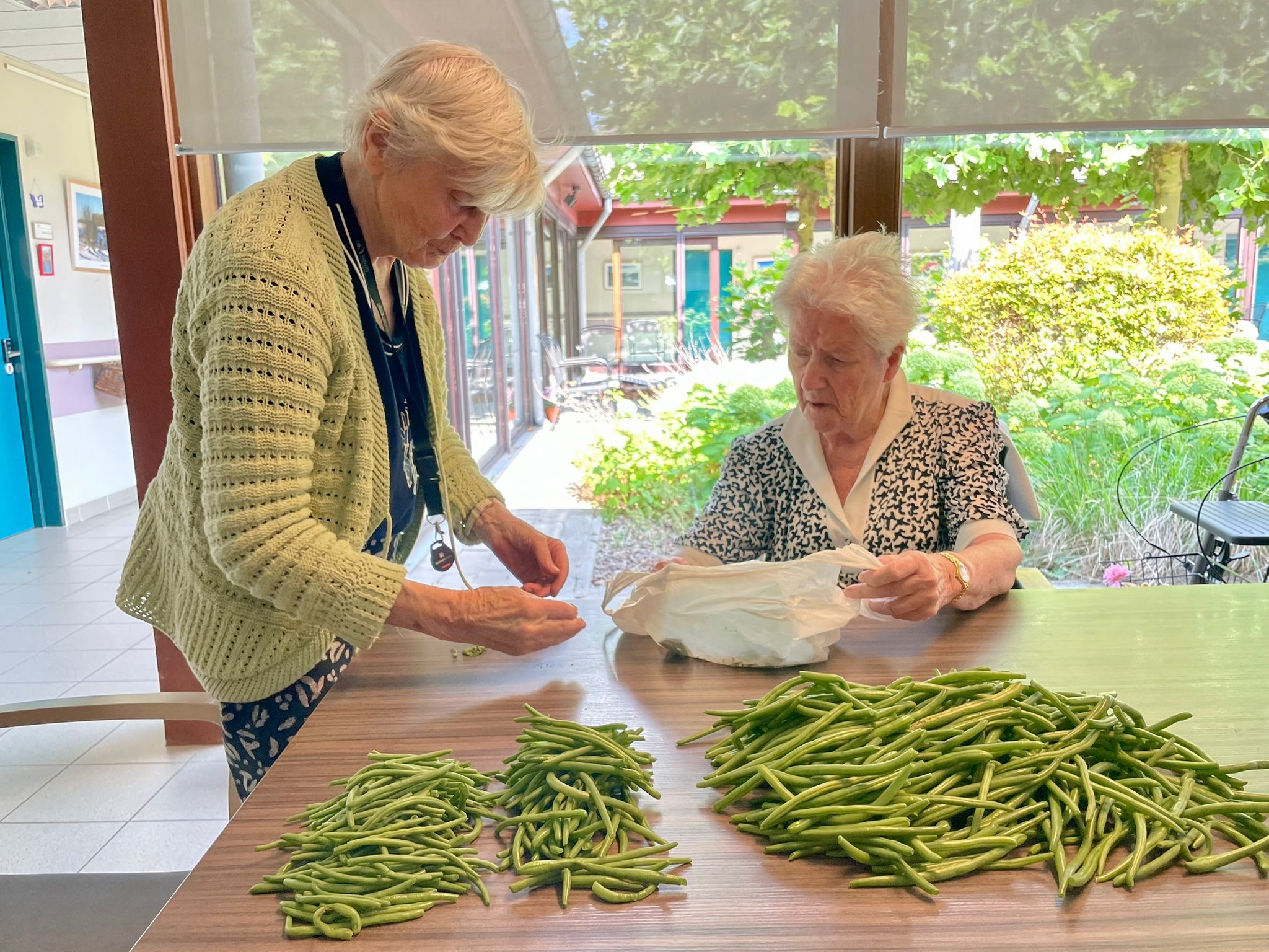Gerda, die naast Agnes zat, hield het zakje open zodat Agnes de afgebroken bonenpuntjes erin zou kunnen doen. Maar Agnes had een duidelijk plan en een open zakje hoorde daar voorlopig nog niet bij. Ik liet de dames verder werken en besloot om later terug te komen voor een stand van zaken.